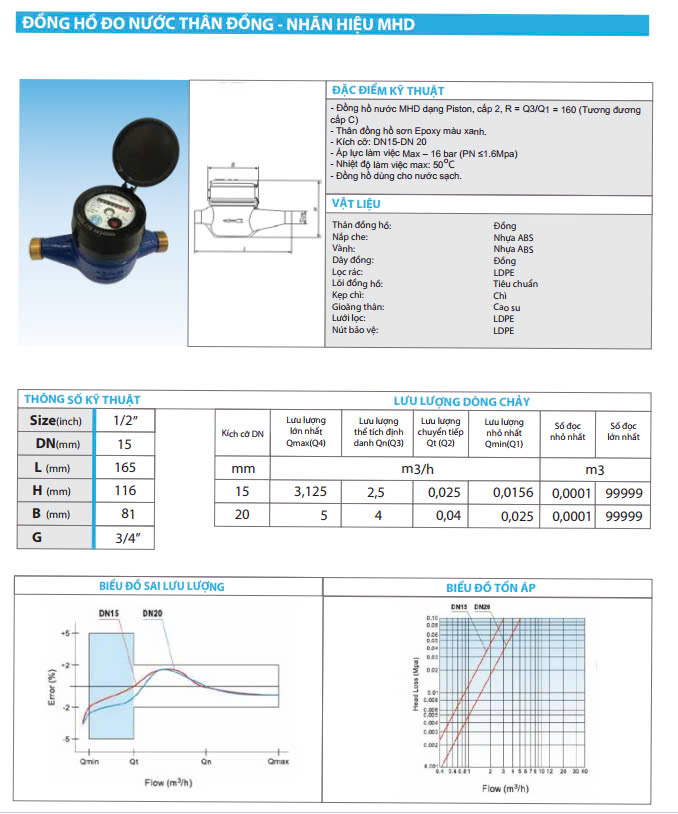 Đồng hồ thân đồng, loại từ, đa tia, cấp C MHD là một trong số những sản phẩm đồng hồ nước phổ biến với thiết kế thân đồng dạng Piston, cấp 2 . Sản phẩm dùng cho nước lạnh được sản xuất theo công nghệ tiên tiến, trong đó mặt đồng hồ được kết hợp bởi vòng số hình tròn, không những hiển thị thông số rõ ràng, chính xác, mà còn mang lại kiểu dáng đẹp. Với độ đo lường chính xác, tốc độ dòng chảy ổn định, sản phẩm của chúng tôi không những đáp ứng tốt, thậm chí vượt trội hơn các chỉ số theo tiêu chuẩn ISO 4064. Kích cỡ DN15